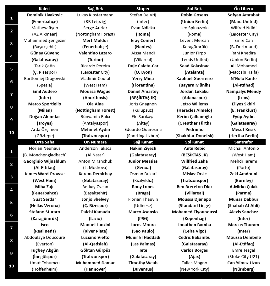 Ben ise bu yazımda tüm tartışmalardan, gerçekleştirilen, gerçekleştirilmeyen ve gerçekleştirilemeyen tüm transferlerden uzak olarak bu yazımı Haziran bültenindeki yazıma atfen yazmak istedim. Bildiğiniz üzere Haziran bültenindeki yazımda her mevkiden belirli kriterlerde Beşiktaş’a transfer edilmesini önerebileceğim alternatifli 10’ar isme yer vermiştim ve bu isimleri hangi kriterlere göre tercih ettiğimi sizlerle paylaşmıştım. Bu yazımda da aynı isimleri transfer yapıp yapmadıklarına ve nerelere transfer olduklarına göre yeniden derleyip sizlere sunmak istedim. Haziran bültenindeki gibi benzer bir tabloyla bu kez oyuncuların mevcut takımlarını da isimlerinin altında sizlerle paylaştım ve bu yaz transfer sezonunda transfer gerçekleştiren oyuncuları, yeni takımlarıyla birlikte koyu fontla belirtmek istedim. Tabloda görebileceğiniz gibi Haziran’da önerdiğim 100 futbolcunun 66 tanesi bu yaz transfer gerçekleştirmişken, sadece 34 tanesi kendi takımlarında kalmıştır. Bu 66 isimden 7 tanesini Galatasaray, üçer tanesini Fenerbahçe ve Trabzonspor, birer tanesini Karagümrük, Çaykur Rizespor, Adanaspor ve İnegölspor kadrosuna katmışken; bilindiği gibi Daniel Amartey ve Ante Rebic de Beşiktaşımıza transfer olmuştur. Özellikle bu 2 ismin faydalı ve başarılı olmasını can-ı yürekten istemekle birlikte, diğer birçok ismin de aslında değerlendirip kadroya katılabileceğini görmek bana sizlerle doğru isimleri paylaştığımı düşündürttü.